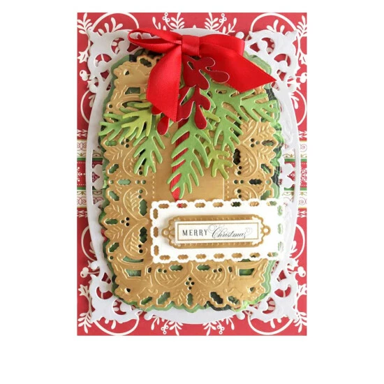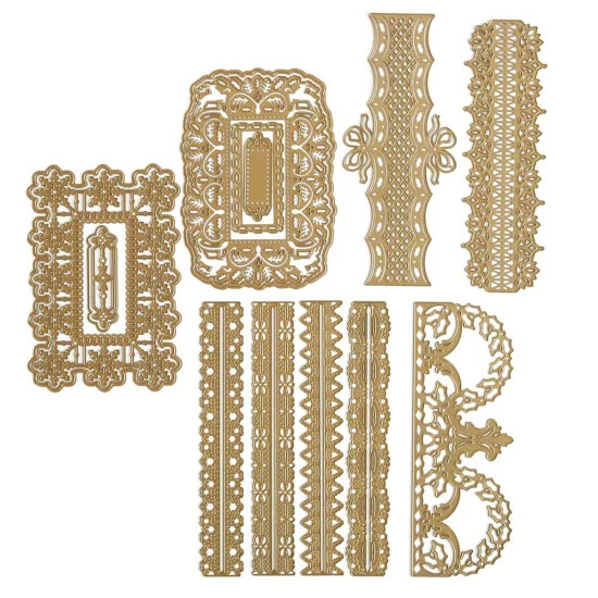 Build a festive foundation for all of your Christmas card crafting with these intricate cut and emboss dies that are smaller than standard dies, but still perfect for projects of any size. The set includes 3 Fancy borders featuring holly, wreathes and snowflakes, 4 Trim borders with 3D technology that cuts, embosses and etches in a single pass and 2 Mini Concentric Frames featuring snowflakes and holly with reindeer.