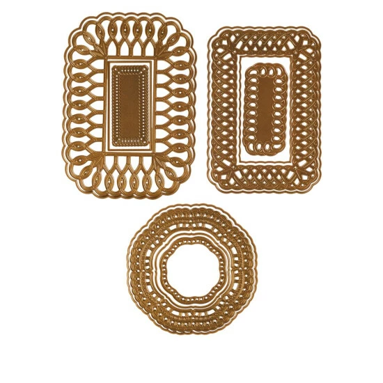 Transform your cardstock from ordinary to extraordinary with this versatile set of reticulated border frame dies. You can mix and layer these cut-outs to create elaborate frames for handmade cards, scrapbook pages and more.